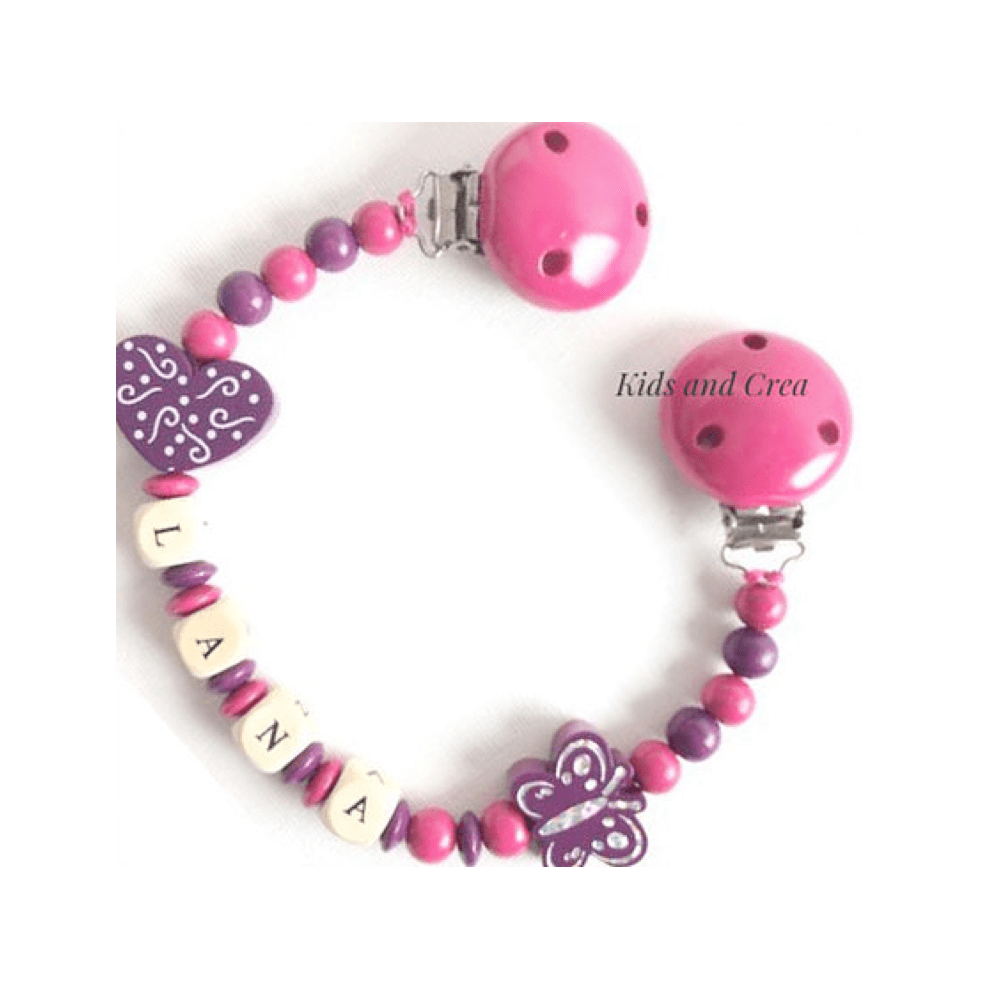 Attache doudou avec le prénom de votre choix. L’attache doudou est fabriquée de perles en bois. La peinture qui recouvre le clip et les perles est non toxique et sans solvant. Résistante à la salive et à la sueur elle est conforme à la norme européenne jouet DIN EN 71.3. Nous confectionnons nos attaches doudou à la main en France.