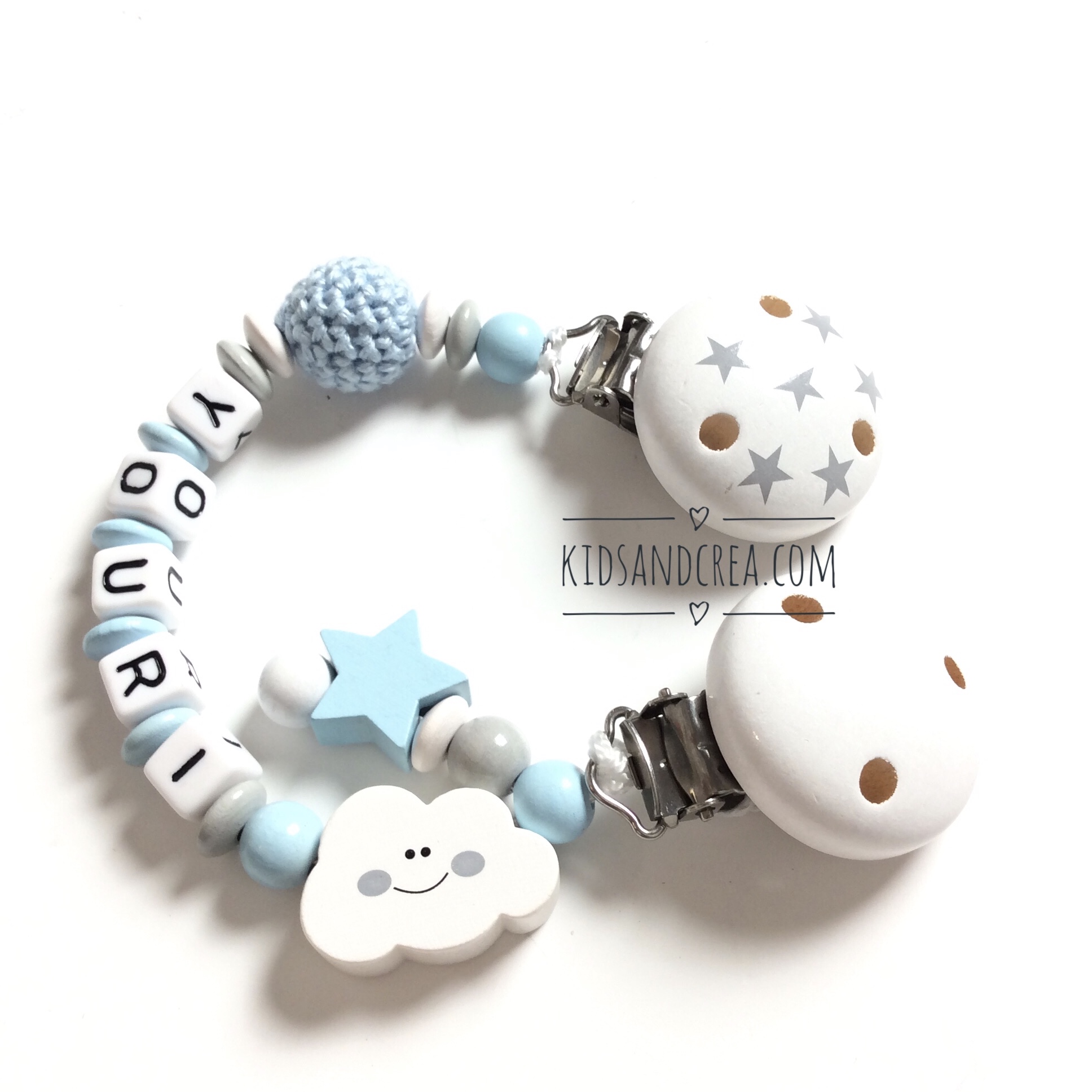 Attache doudou bois étoiles à personnaliser avec le prénom de votre choix. L’accroche doudou est fabriquée de perles en bois. La peinture qui recouvre le clip et les perles est non toxique et sans solvant. Résistante à la salive et à la sueur elle est conforme à la norme européenne jouet DIN EN 71.3. Nous confectionnons nos attaches doudou à la main en France.