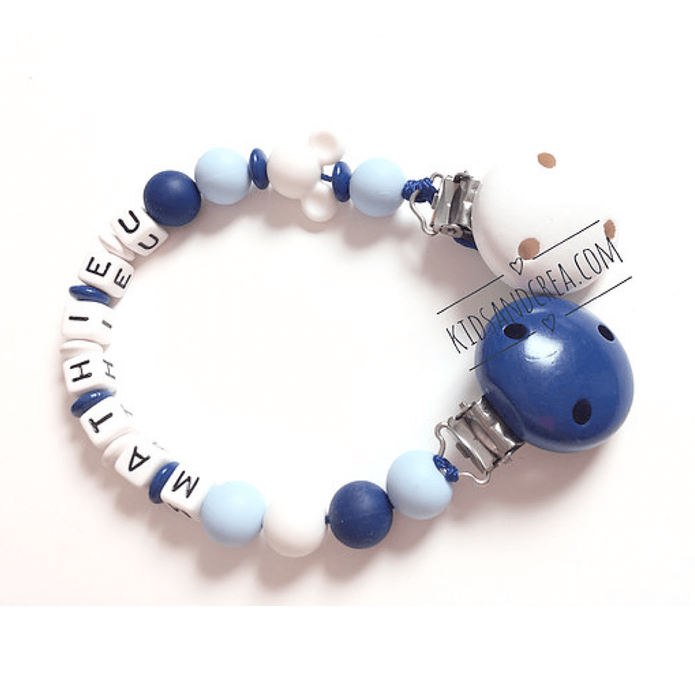 Attache doudou avec le prĂ©nom de votre choix. L’attache doudou est fabriquĂ©e de perles en bois. La peinture qui recouvre le clip et les perles est non toxique et sans solvant. RĂ©sistante Ă la salive et Ă la sueur elle est conforme Ă la norme europĂ©enne jouet DIN EN 71.3. Nous confectionnons nos attaches doudou Ă la main en France.