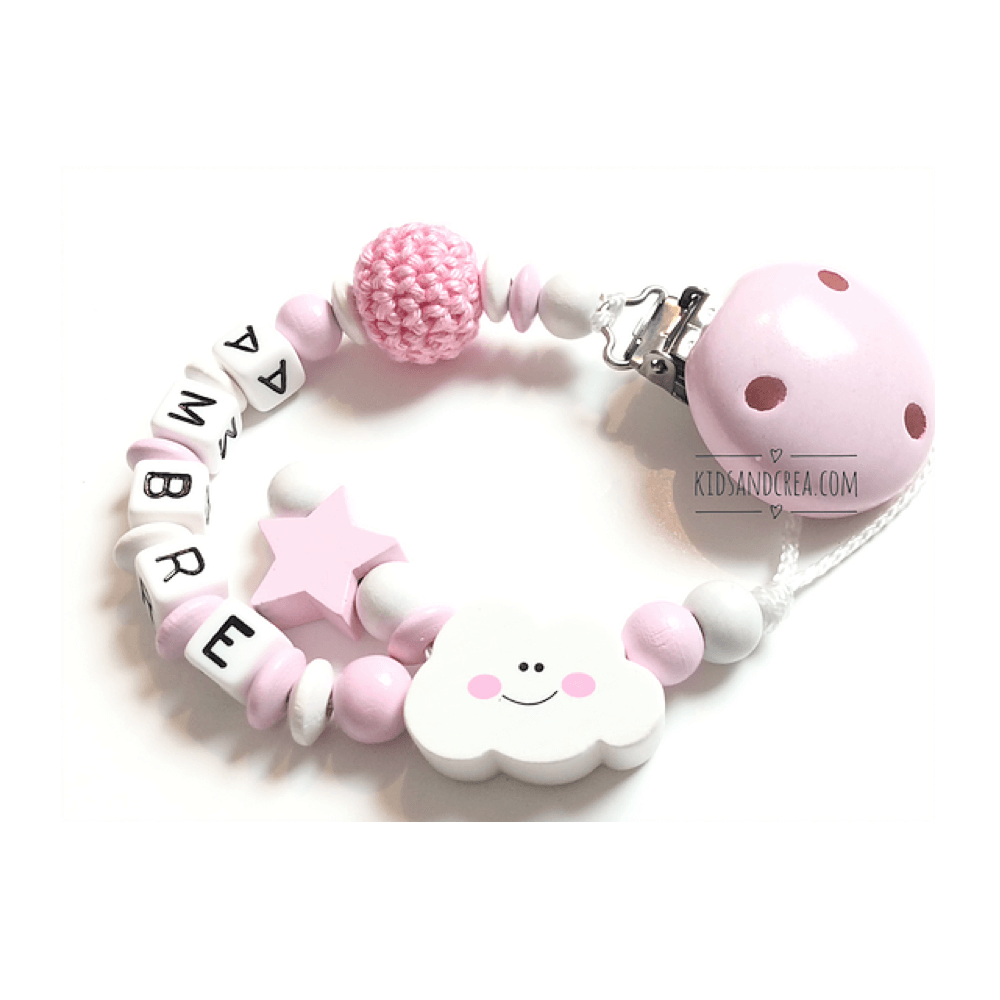 L’attache tétine boule de coton F58 se distingue par son design délicat et ses matériaux naturels. Elle est composée de perles en bois naturel, gravées du prénom de votre enfant pour une touche unique et personnalisée. La pièce maîtresse de cette attache est une grosse perle en crochet de coton mercerisé, dans un rose tendre, qui apporte une texture agréable pour bébé. Les motifs nuages et étoiles, associés au clip en bois rose, ajoutent une touche poétique, parfaite pour les petites princesses.