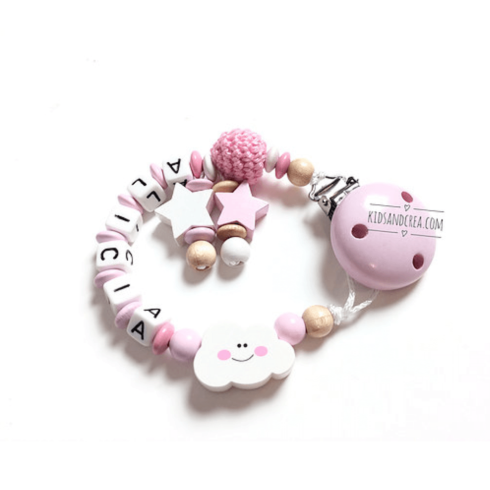 Attache tetine avec le prénom de votre choix. L’attache tetine est fabriquée de perles en bois. La peinture qui recouvre le clip et les perles est non toxique et sans solvant. Résistante à la salive et à la sueur elle est conforme à la norme européenne jouet DIN EN 71.3. Nous confectionnons nos attaches tétines à la main en France.