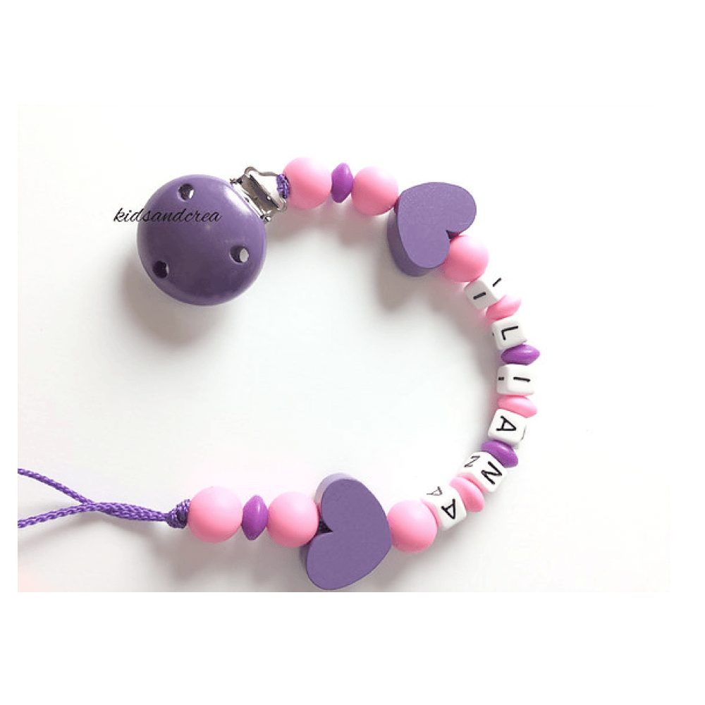 Attache tetine dentition personnalisée avec le prénom de votre choix. L’attache tetine est fabriquée de perles en bois. La peinture qui recouvre le clip et les perles est non toxique et sans solvant. Résistante à la salive et à la sueur elle est conforme à la norme européenne jouet DIN EN 71.3. Nous confectionnons nos attaches tétines à la main en France.
