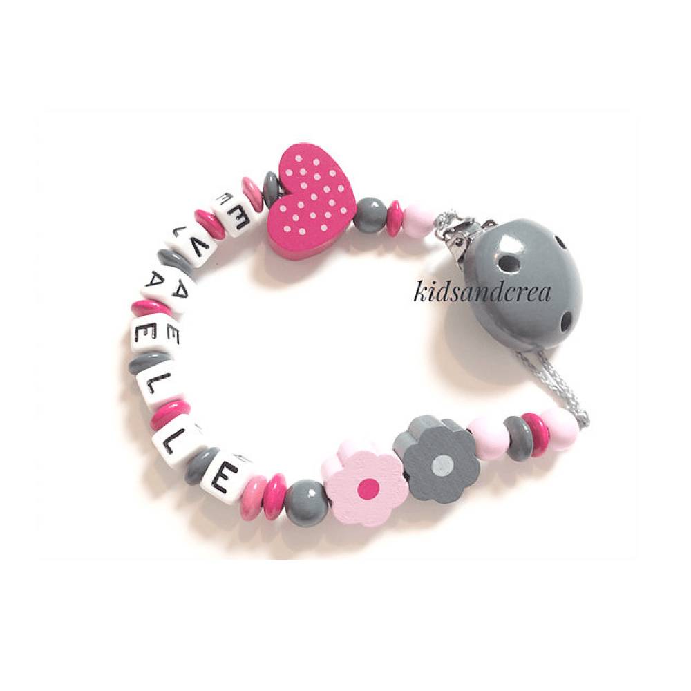 Attache tetine pour les amoureux des plantes et des fleurs avec le prĂ©nom de votre choix. L’attache tetine est fabriquĂ©e de perles en bois. La peinture qui recouvre le clip et les perles est non toxique et sans solvant. RĂ©sistante Ă la salive et Ă la sueur elle est conforme Ă la norme europĂ©enne jouet DIN EN 71.3. Nous confectionnons nos attaches tĂ©tines Ă la main en France.