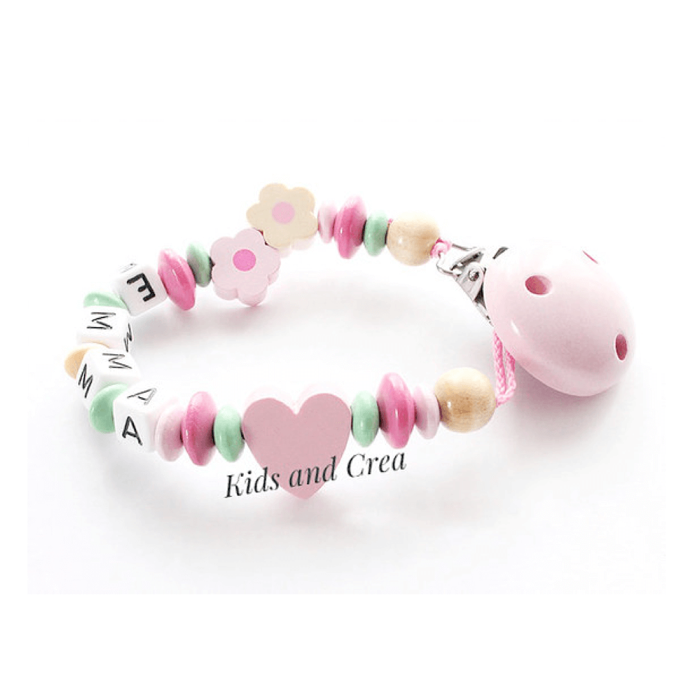 Attache tetine avec le prénom de votre choix. L’attache tetine est fabriquée de perles en bois. La peinture qui recouvre le clip et les perles est non toxique et sans solvant. Résistante à la salive et à la sueur elle est conforme à la norme européenne jouet DIN EN 71.3. Nous confectionnons nos attaches tétines à la main en France.