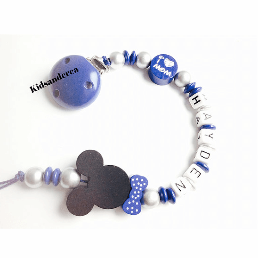 Attache tetine avec le prĂ©nom de votre choix. L’attache tetine est fabriquĂ©e de perles en bois. La peinture qui recouvre le clip et les perles est non toxique et sans solvant. RĂ©sistante Ă la salive et Ă la sueur elle est conforme Ă la norme europĂ©enne jouet DIN EN 71.3. Nous confectionnons nos attaches tĂ©tines Ă la main en France.