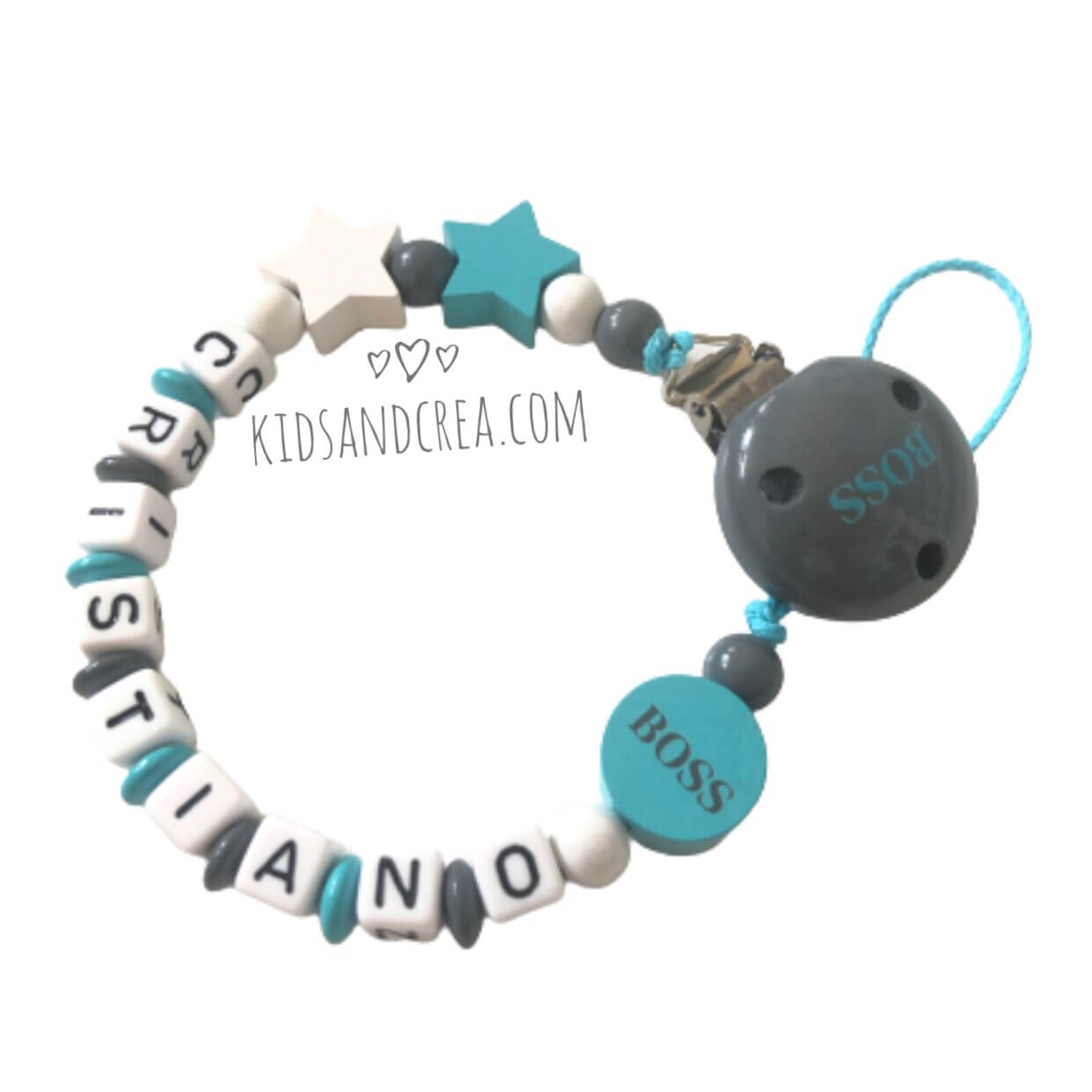 Attache tetine avec le prénom de votre choix. L’attache tetine est fabriquée de perles en bois. La peinture qui recouvre le clip et les perles est non toxique et sans solvant. Résistante à la salive et à la sueur elle est conforme à la norme européenne jouet DIN EN 71.3. Nous confectionnons nos attaches tétines à la main en France.
