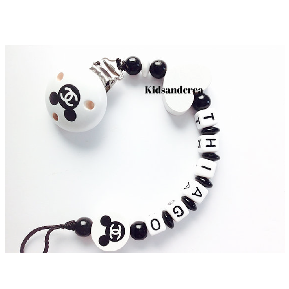 Attache tetine avec le prĂ©nom de votre choix. L’attache tetine est fabriquĂ©e de perles en bois. La peinture qui recouvre le clip et les perles est non toxique et sans solvant. RĂ©sistante Ă la salive et Ă la sueur elle est conforme Ă la norme europĂ©enne jouet DIN EN 71.3. Nous confectionnons nos attaches tĂ©tines Ă la main en France.