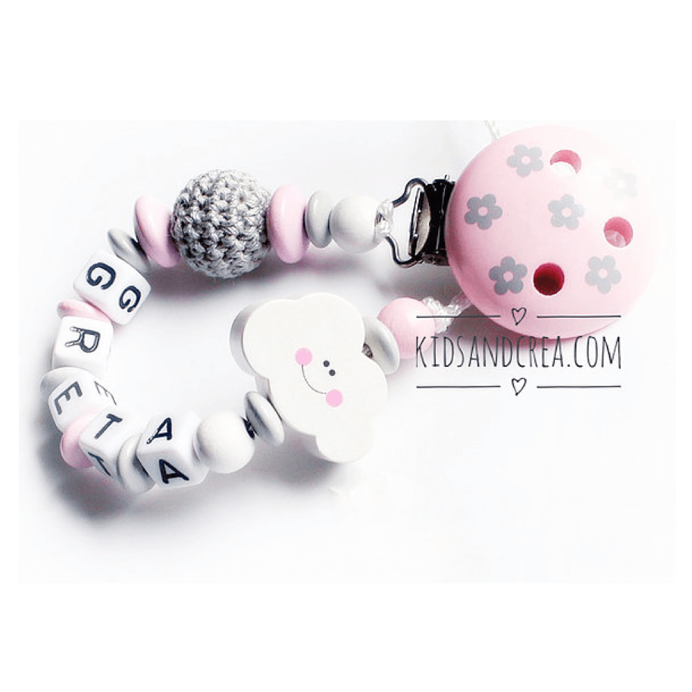 Attache sucette perle en bois avec un clip motif petites fleurs. Nous personnalisons les attaches sucettes avec le prénom de votre enfant. Ainsi, la personnalisation au prénom de votre enfant en faire un accessoire et cadeau personnalisé original.Nous confectionnons nos attaches tétines en France et de manière artisanale.