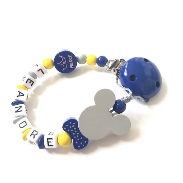 Attache tétine personnalisée jaune avec le prénom de votre enfant pour ne plus perdre la tutute de bébé. Fabriquée en France à partir de perles ronde en bois. Les peintures sont non toxiques sans BPA sur le clip. Un accessoire pour bébé aussi utile qu’original, confectionné à partir de matériaux de qualité conformes aux normes européennes : NF 1400. Nos attaches sucettes en bois peuvent toutes être assorties à un hochet ou jouet de dentition. Démarquez vous en l’ajoutant à votre liste de naissance