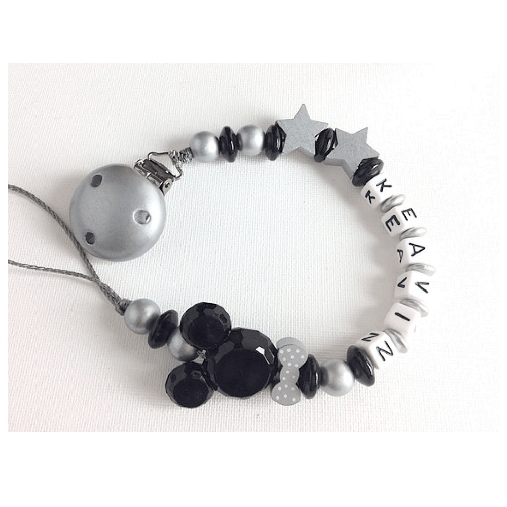 Attache tetine étoiles argent avec le prénom de votre choix. L’attache tetine est fabriquée de perles en bois. La peinture qui recouvre le clip et les perles est non toxique et sans solvant. Résistante à la salive et à la sueur elle est conforme à la norme européenne jouet DIN EN 71.3. Nous confectionnons nos attaches tétines à la main en France.
