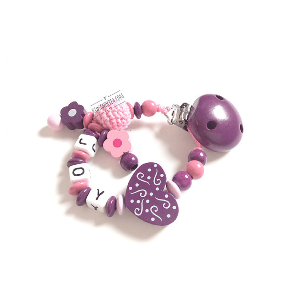Attache tétine prénom fleurs et crochet – Élégance et praticité