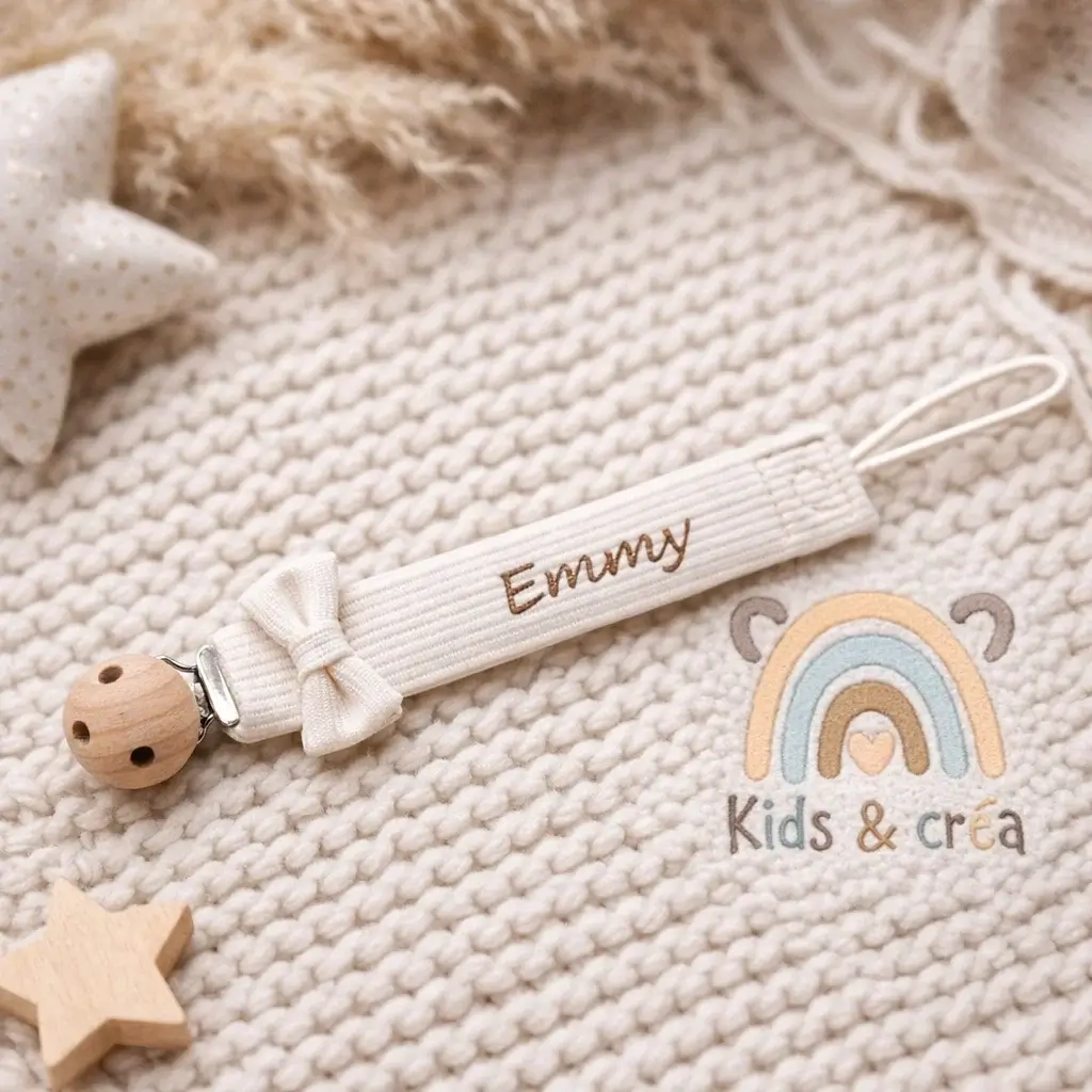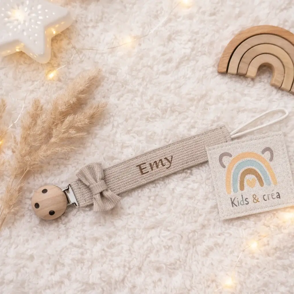 Le clip en bois naturel permet une fixation sécurisée sur les vêtements de bébé, tandis que la boucle en cordon est compatible avec la majorité des tétines à anneau. Le nœud décoratif assorti apporte une touche délicate et tendance, idéale pour un accessoire bébé à la fois utile et esthétique.