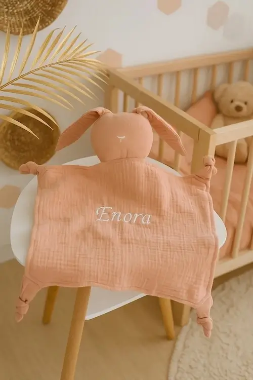 Ce joli doudou plat lapin en coton bio tout doux coloris rose. le cadeau idéal pour la naissance d’un bébé. Personnalisation par broderie en France. Ce doudou personnalisé bébé fille en double gaze de coton sera le compagnon idéal de votre bébé fille dès sa naissance. Il sera parfait pour l’aider à passer des nuits douces. Sa forme lui permet d’être facile à attraper. Votre enfant pourra le saisir seul.