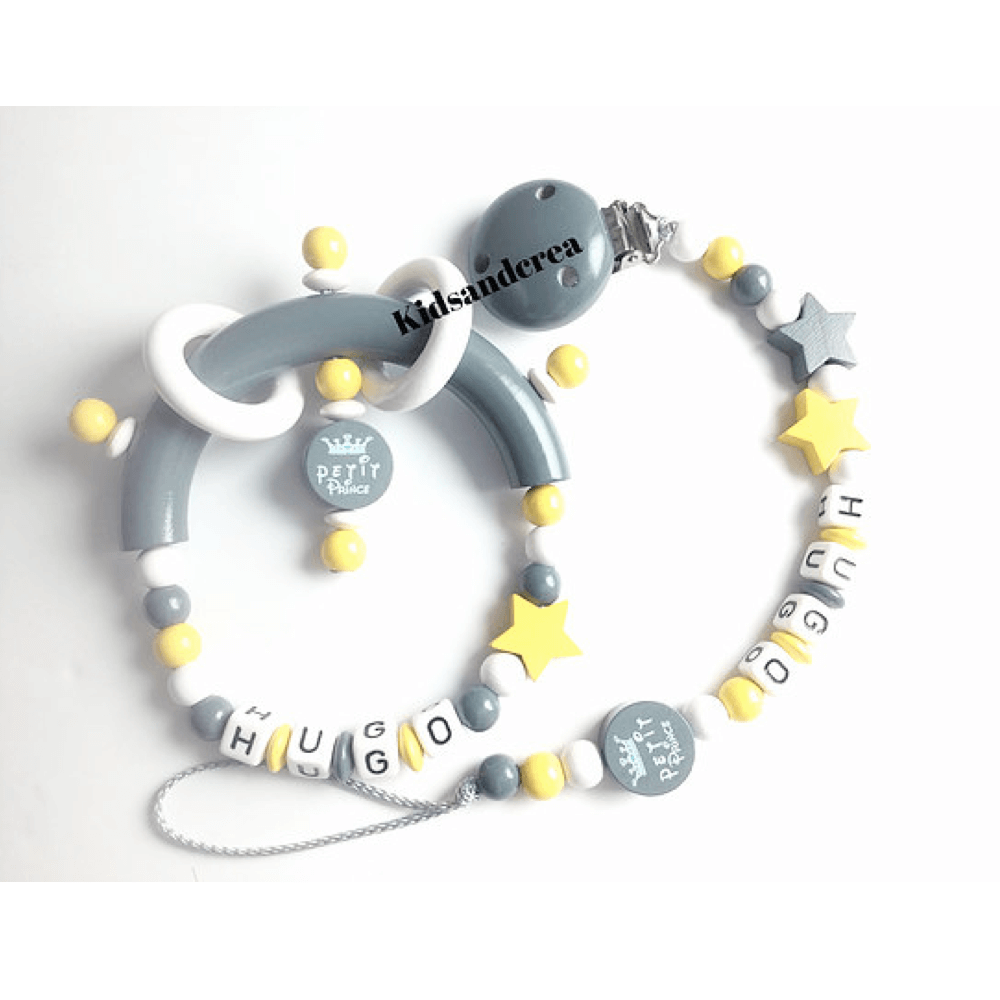 Attache tetine et hochet avec le prĂ©nom de votre choix. L’attache tetine est fabriquĂ©e de perles en bois. La peinture qui recouvre le clip et les perles est non toxique et sans solvant. RĂ©sistante Ă la salive et Ă la sueur elle est conforme Ă la norme europĂ©enne jouet DIN EN 71.3. Nous confectionnons nos attaches tĂ©tines Ă la main en France.
