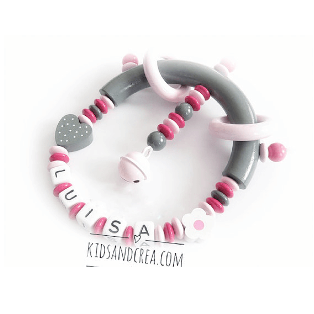 Hochet avec le prénom de votre choix. Le hochet est fabriquée de perles en bois. La peinture qui recouvre les perles est non toxique et sans solvant. Résistante à la salive et à la sueur elle est conforme à la norme européenne jouet DIN EN 71.3. Nous confectionnons nos hochets à la main en France.