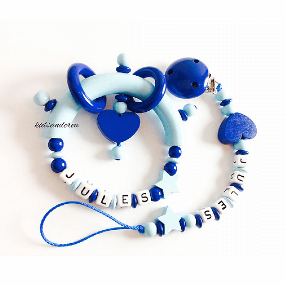 Attache tetine avec le prĂ©nom de votre choix. L’attache tetine est fabriquĂ©e de perles en bois. La peinture qui recouvre le clip et les perles est non toxique et sans solvant. RĂ©sistante Ă la salive et Ă la sueur elle est conforme Ă la norme europĂ©enne jouet DIN EN 71.3. Nous confectionnons nos attaches tĂ©tines Ă la main en France.