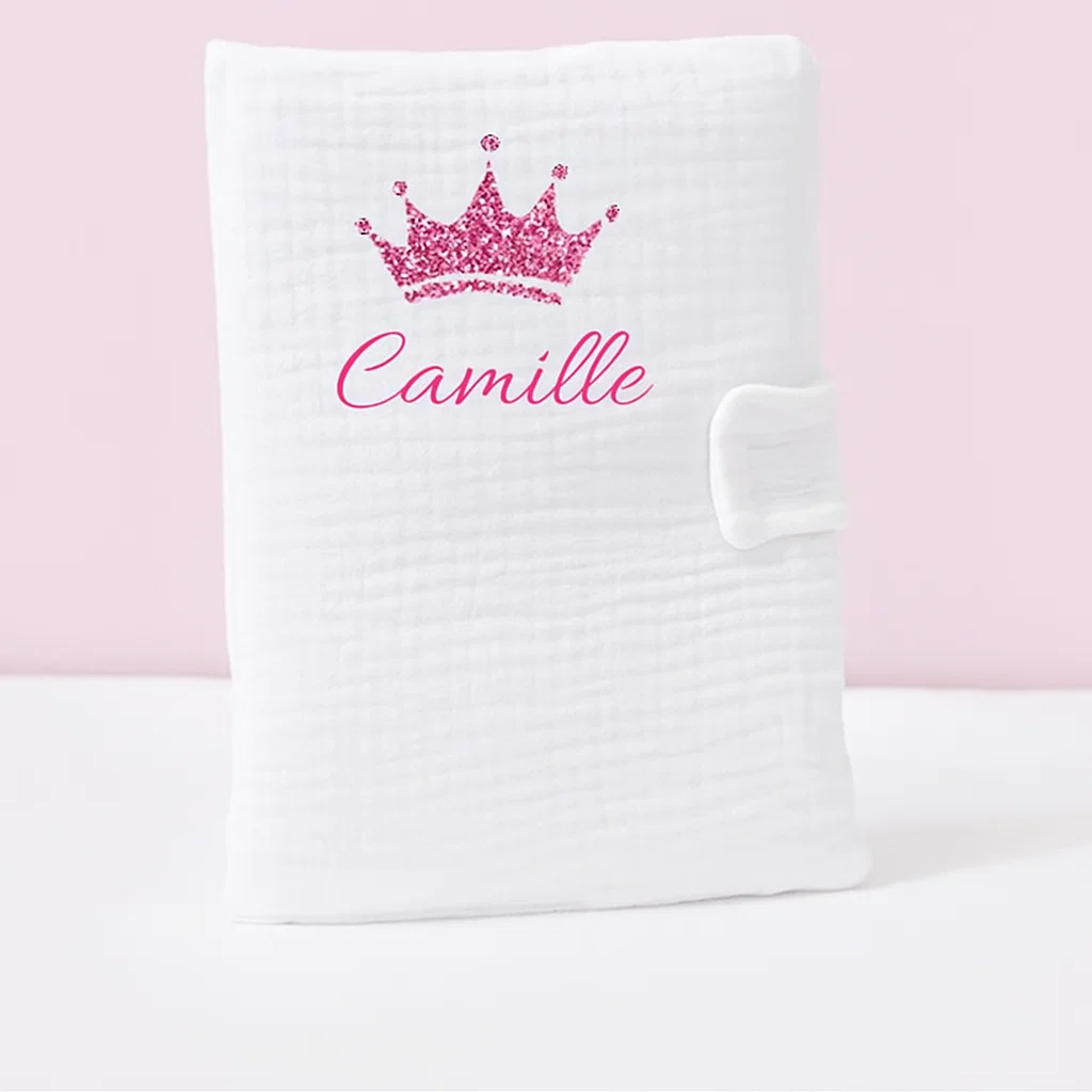 Offrez une protection élégante et personnalisée au carnet de santé de votre bébé avec notre protège carnet de santé en gaze de coton blanc, orné d’un motif couronne doré pailleté et brodé au prénom de votre enfant.