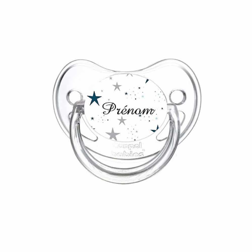 Tetine prénom avec le prénom de votre choix. La tétine est fabriquée en silicone. Tétine garantie sans BPA sans PVC ni phtalate non toxique et sans solvant. Résistante à la salive et à la sueur elle est conforme à la norme européenne EN 1400.